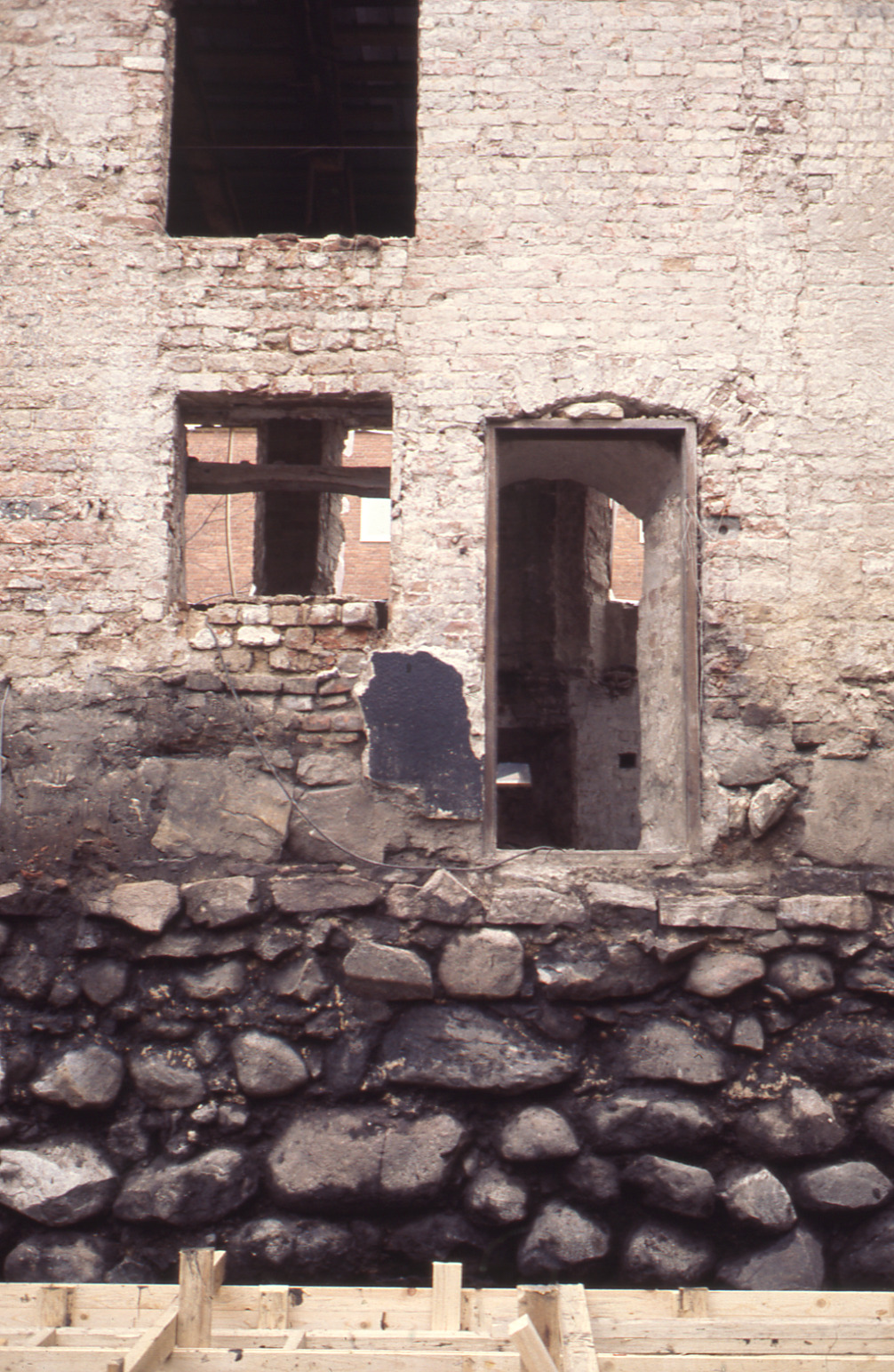 • Lundaarkeologiska avdelningens fotonegativ. Lund. Kv. Maria Magle 11. Husets östfasad & grundmur, mellersta partiet, sedd fr. Ö.