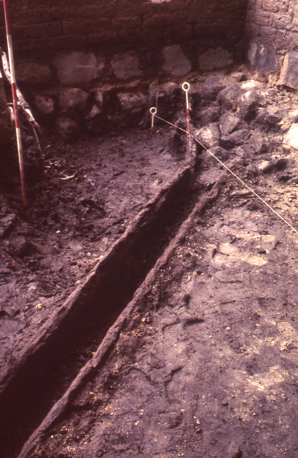 • Lundaarkeologiska avdelningens fotonegativ. Lund. Kv. Maria Magle 11. Interiör, Dräneringsrännans nordöstra parti, sedd fr. SV.