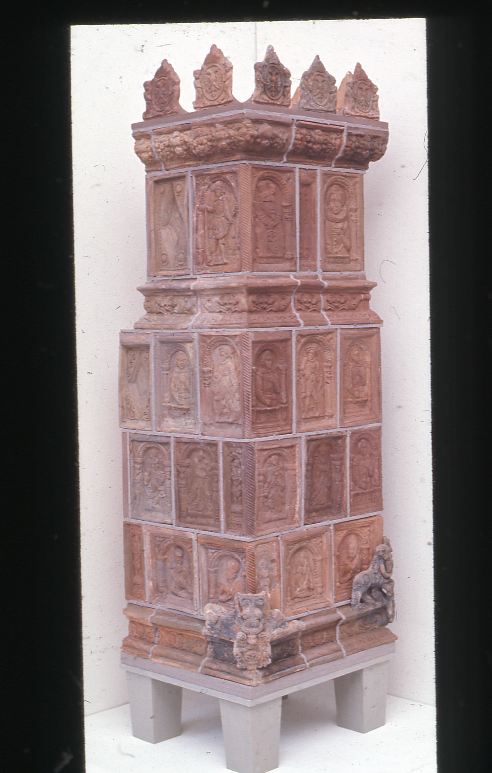 • Lundaarkeologiska avdelningens fotonegativ. Lund. Biläggarugn, 1600-talets mitt Rekonstr. av jordfunna kakel. Färgfoto.