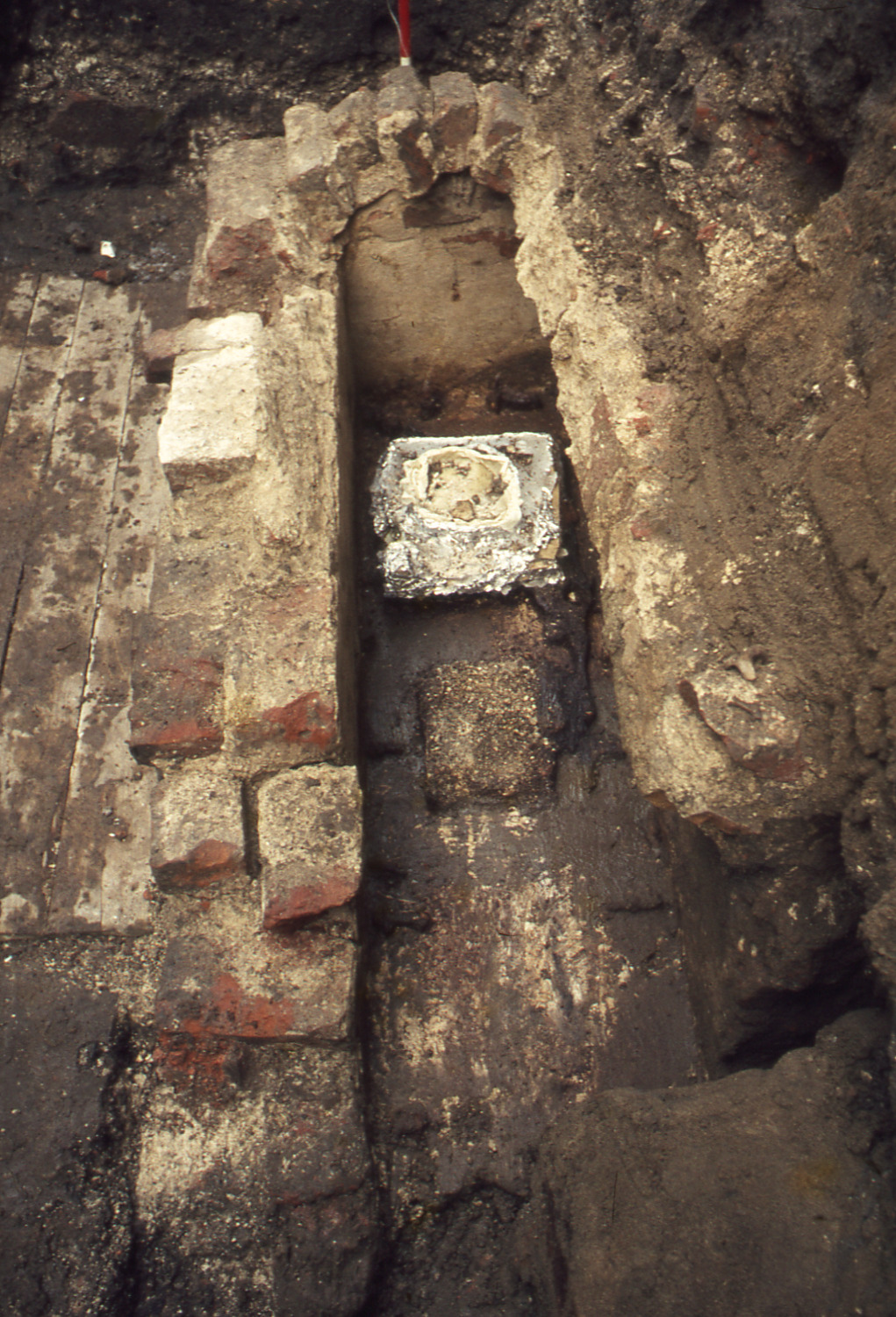 • Lundaarkeologiska avdelningens fotonegativ. Lund. Klostergatan. Tegelsarkofagen utan lock. [?bild]. Golvet med paraffininggjutna "skrinet". Snett uppifrån mot V.