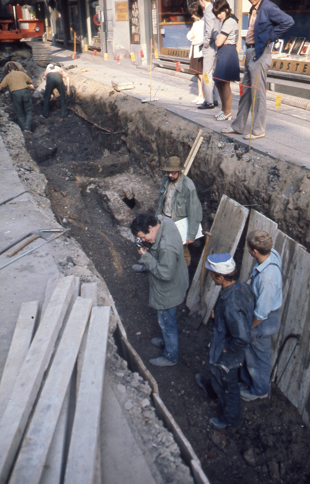 • Lundaarkeologiska avdelningens fotonegativ. Lund. Klostergatan. Bild av schaktet med Claes Wahlöö (m. kamera) N-O Nilsson (i hällen) samt ..??