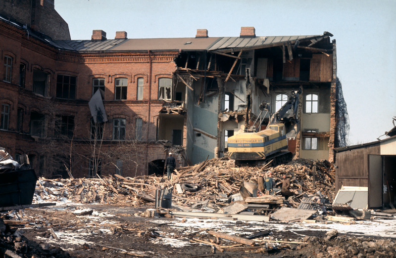 fotografi, byggnad, grävmaskin, rivning, kontainer, stadsbebyggelse, bakgård, skjul, hus