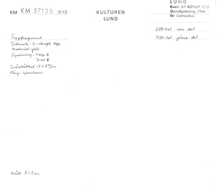 • Tygfragment. Ylle. 3-skaft kypert. Varp Z, inslag S. Trådtäthet 13x5 tr/cm. Ljusbrun.