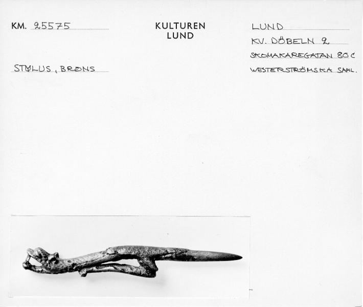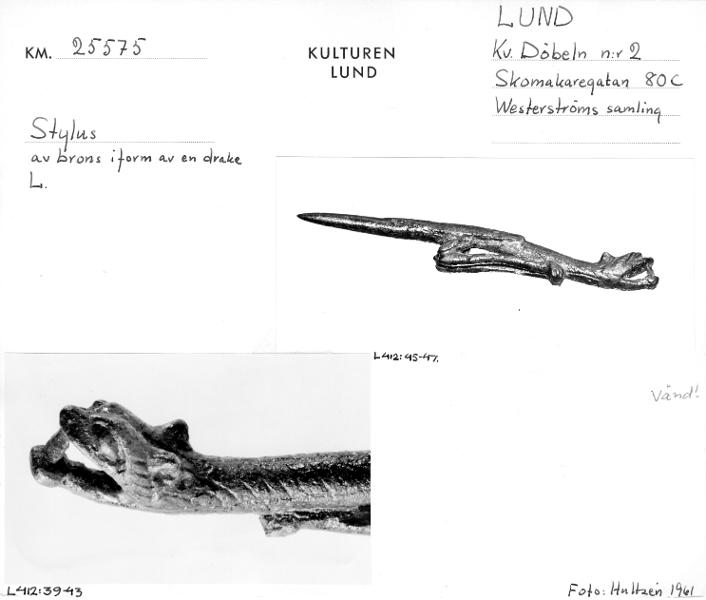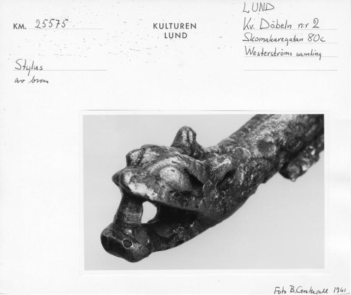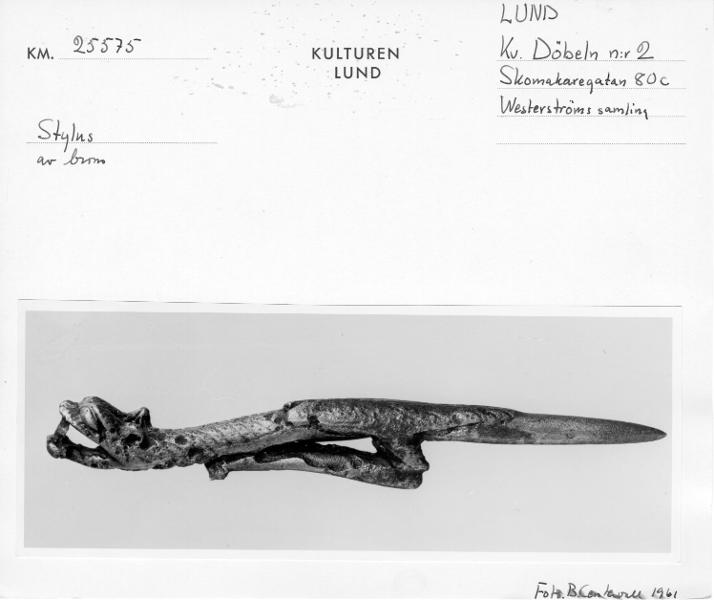 "Här får den skriftliga traditionen representeras av styli som är funna i Lund. En stylus kan sägas vara vår äldsta typ av >penna>, en slags griffel som användes för att skriva med i vax. Vaxet var applicerat inom en försänkt ram, oftast av trä, på en s.k. vaxtavla. Texten var lätt att radera ifall man skrev fel eller ville skriva något nytt. Skulle texten bevaras skrevs den över till pergament med en fjäderpenna doppad i bläck. Flera av de från medeltiden bevarade handskrifterna har utgått från anteckningar som förts med stylus och vaxtavla. Från och med 1000-talets första halva börjar styli och även ett fåtal vaxtavlor uppträda i fyndmaterial från Lund. Med smärre variationer i utformningen finns de sedan med, åtminstone till slutet av medeltiden. Företrädesvis påträffas de i anslutning till samtida kyrkor, konvent och tomter med anknytning till kyrkliga ämbeten." Kulturens årsbok 1999, Lundberg Anders, s. 118, bild s. 119.
