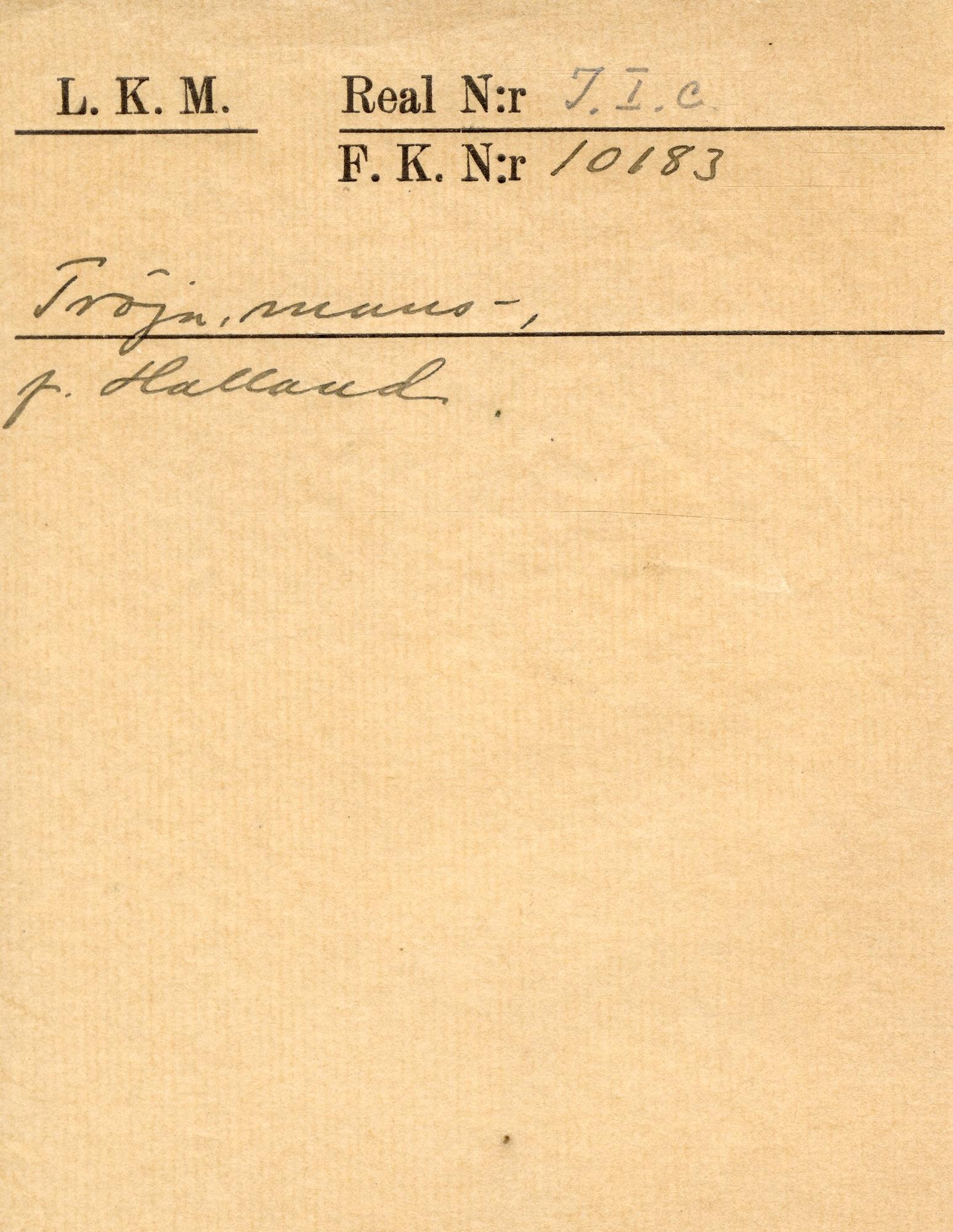 Mörkblå, kort till midjan. Tolv klädda knappar i två rader, men knäpps med lösknappar? Liggande krage och brungrått bomullsfoder på framsidan. Blågrått ylle i ryggen. Två fickor fram, innerficka på vänster sida. Uppslag på ärmarna. Ej fållad i nederkanten. Vadderad under slaget. Inga skador tillkommit efter konserveringen, dec 1994.