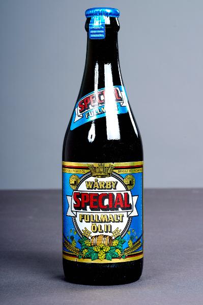 Grön 33 cl, två rektangulära pappersetiketter i olika storlekar med glänsande blå bakgrund, den större etiketten har rik dekor och text i guld, vitt, rött, svart, grönt, brunt och silver, den mindre etiketten har text och dekor i rött, vitt och guld, glänsande blå kapsyl som dras av med röd text.