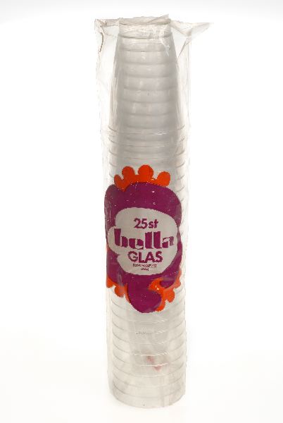 Långsmal påse? med tryck och text i lila, orange och vitt, som innehåller 25 st plastglas staplade i varandra, glasen är mönstrade med frostade ovaler och de rymmer 38 cl.
