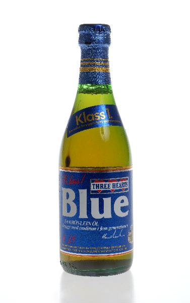 Grön flaska 33 cl. Två rektangulära pappersetiketter i olika storlek med glänsande blå bakgrund. Text och dekor i vitt, rött, blått, guld och silver. Blå kapsyl med tryckt varumärke och en etta. Kapsylen försluts med blank folie i blått och guld som går en bit ner på halsen med rak avslutning.