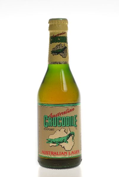 Grön flaska 33 cl. Rektangulär pappersetikett med ljusgul bakgrund. Text och dekor i glänsande grönt, rött och guld.. Bild av Australien och krokodil. Ljusgul kapsyl med tryckt varumärke och klass i grönt, rött och svart. Kapsylen försluts med ljusgul folie som går långt ner på halsen och avslutas med en snibb. Folien har text och dekor i grönt, guld och rött.