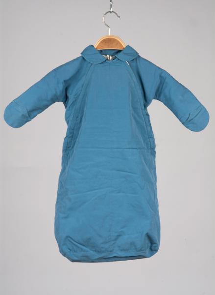 Åkpåse sydd av petroleumblå bomullspoplin. Fodrad med vit bomullsteddy. Långa ärmar med uppvikbar vante. Under kragen extra klaffar av det blå tyget, vilka knäppes med två tryckknappar. Påsen öppnas med två, diagonalt ställda, blixtlås av metall från kragen och cirka 32 cm ner mot sidsömmen.