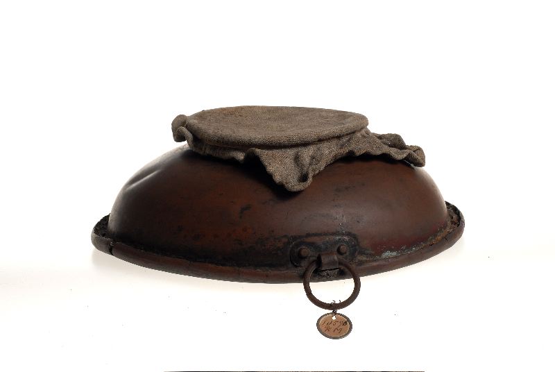 • Rund, kraftigt bukig sida, kantvulst. Fastnistad upphängningsögla. I botten fastspänd silduk.
