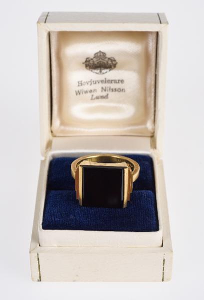 Herrsmycke i form av klackring av 18 karat gult guld. Kraftig ringskena med hög, trappstegsformad fattning vilken omsluter en slät platta av onyx. Stämplar; Wiwen Nilsson, Lunds stadsstämpel, AN, 18 K, kattfot, F9. Förvarad i originaletui av läderpräglad, beigevit papp med tunna guldlinjer längs sidorna. Invändigt fodrad med beige polyester och mörkblå sammet. I underdelen en utsparad skåra för ri...