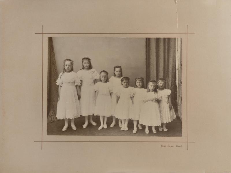 8 flickor, stående, kransflickor i olika åldrar, alla i vita klänningar, vita strumpor, vita skor med rosetter och kransar i håret. Tvåa från höger Dagny Ljungström. Monterat på beige kartong med brunt tryck. Påskrift på baksidan: 1. Reihe vorne. 2. von rechts, etwas vor den anderen: Dagny Ljungström ca. 4 Jahre alt.