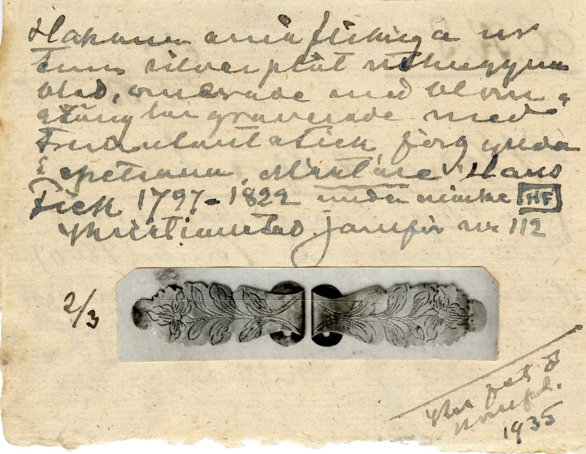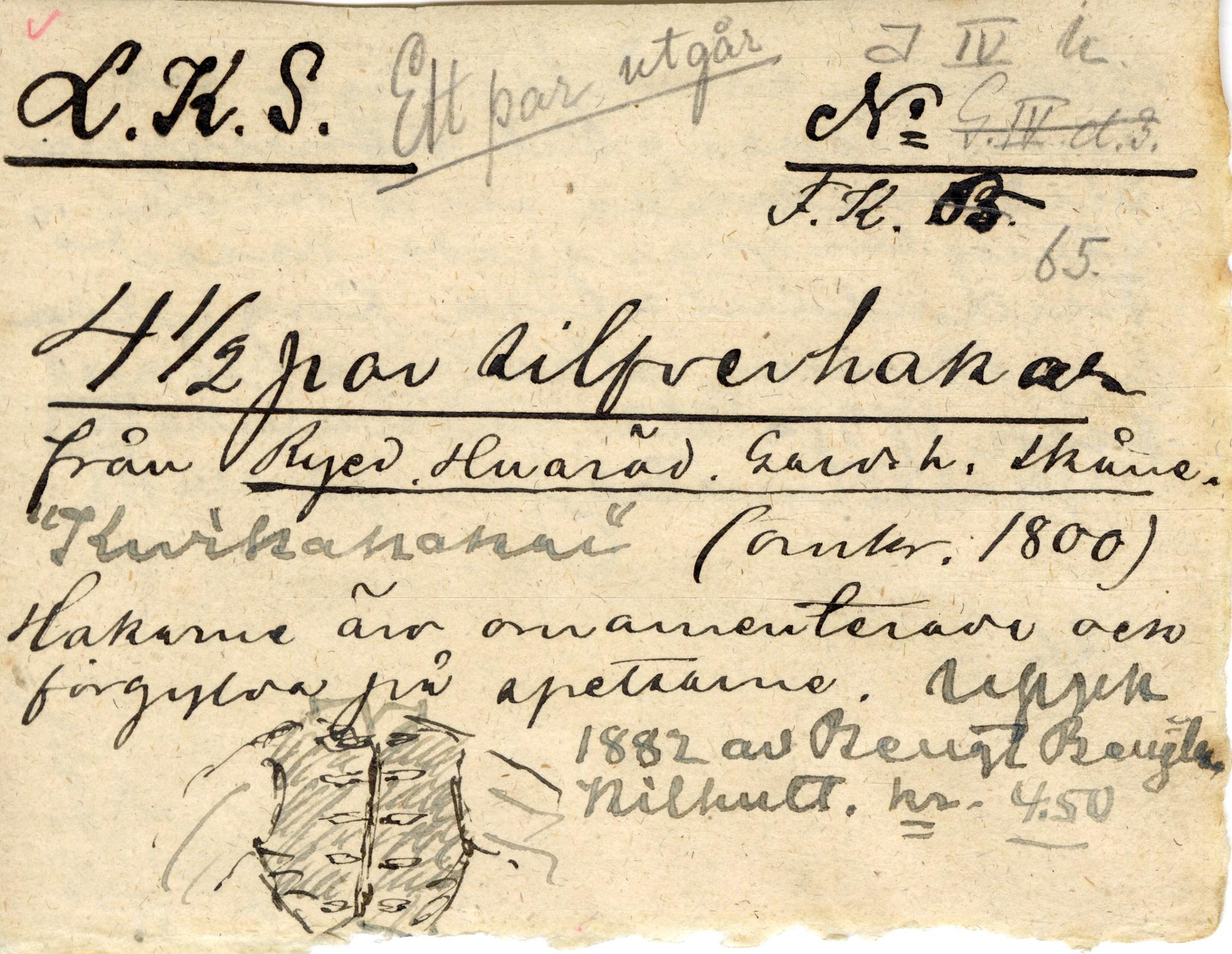 • Uppköpt genom lumpsamlare Bengt Bengtsson i Kilhult, Svensköps socken. Enligt katalogkort daterat 1936 endast 3 par.