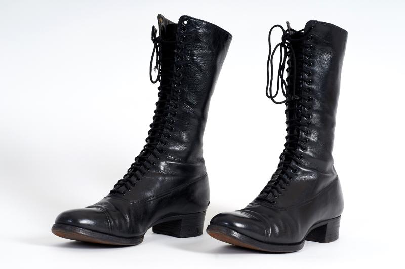 • Svart skinn. Nåtlingen består av överdel med baknåt, tåhätta och skaft med baknåt. Snöras med 25 par snörhål. Randsydda. Lädersula och läderklack. Fodrade, även plösen, med ljuslila bomullsfoder. Mått: klack H 3,2 cm, Br 5,5 cm. Defekter: missfärgade i fodret, blekt, lite fläckigt.