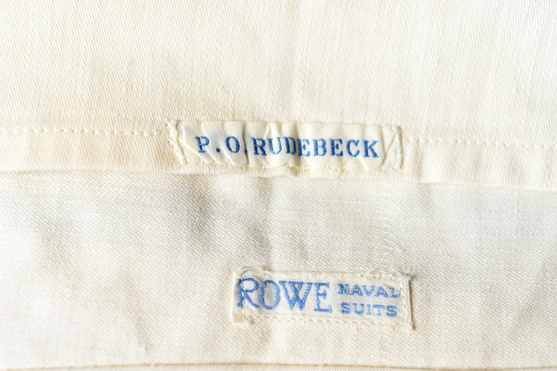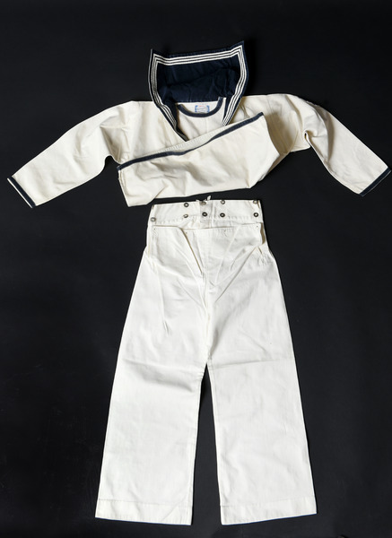 Vit, i kraftig bomullssatin. Långa ärmar med smal mörkblå kant nertill. Mörkblå sjömanskrage med tre smala vita band. Broderat märke på vänster ärm. Två vita knytband i den v-formade urringningen. Etikett i nacken: P.O. RUDEBECK, samt fabriksetikett: ROWE BOND ST LONDON & GOSPORT CORRECT SAILOR SUITS. Vita långbyxor med lucka fram. 5,5 cm bred linning som knäpps fram med två silvermetallknappar. L...