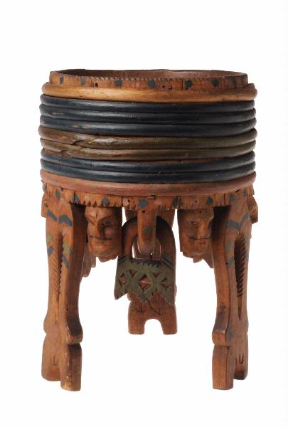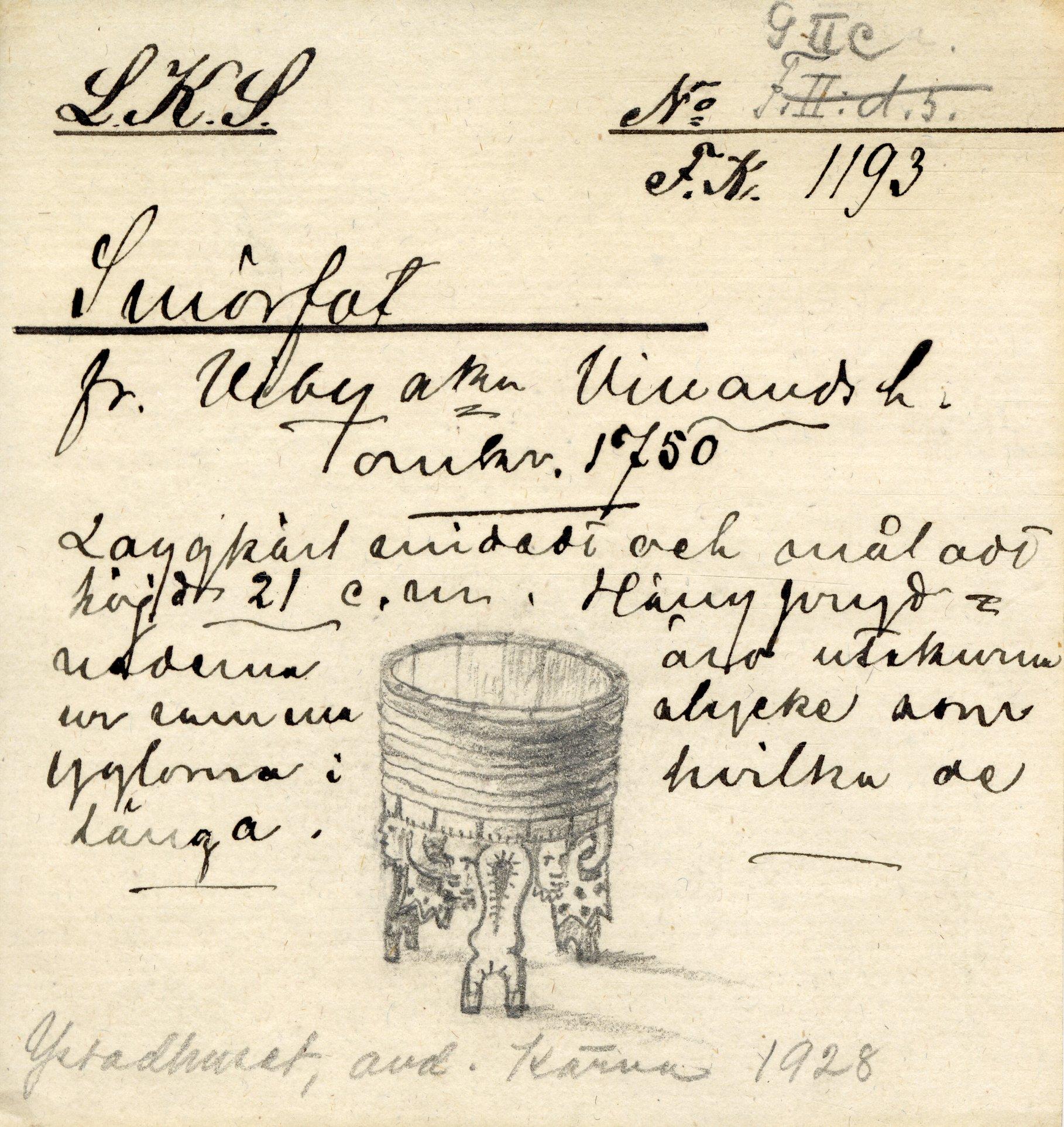 Trebent. Ovandelen rund, fästad med vidjor. Benen med utskurna hjärtan. Runt nederkanten skurna ansikten. Runt mynnings- och nederkant målade prickar. Dekoren på benen även den punktvid förhöjd med färg.