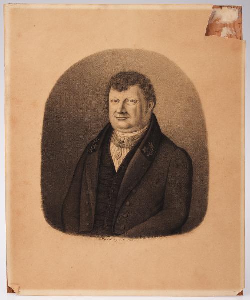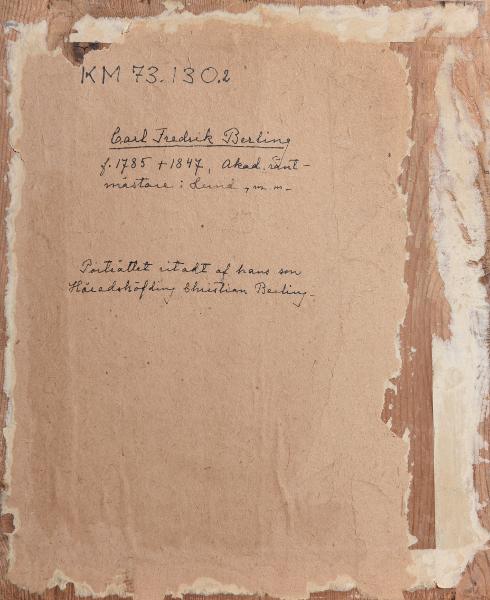 Porträtt föreställande Carl Fredrik Berling. Bröstbild med svag vänsterprofil. C.B är ikläd akademisk frack med lundabroderad krage och bär om halsen Vasaordens kommendörstecken i ett band. Under teckningen är textat; "Ritad af C. Berling i Nov. 1840". Rundad form. Har tidigare varit monterad inom glas och ram men är nu urtagen och löst liggande mot bakstycket. På backstyckets baksida skrivet med tusch; "Carl Fredrik Berling f. 1785 †1847, Akad.räntmästare i Lund m.m." samt "Porträttet ritadt af hans son Häradshöfding Christian Berling".