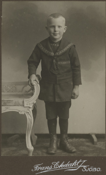 • Ateljébild, gosse i sjömansliknande kostym står med handen på en taburett. (Troligen Alriks bror Gunnar vid ca 6 års ålder).