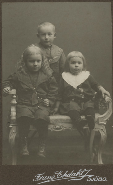 Ateljébild, 3 barn sitter på och står bakom taburett. (Alrik, ca 6 år stående, Einar,ca 4 år sitter till vänster, Gunnar, ca 2 år, sitter till höger).