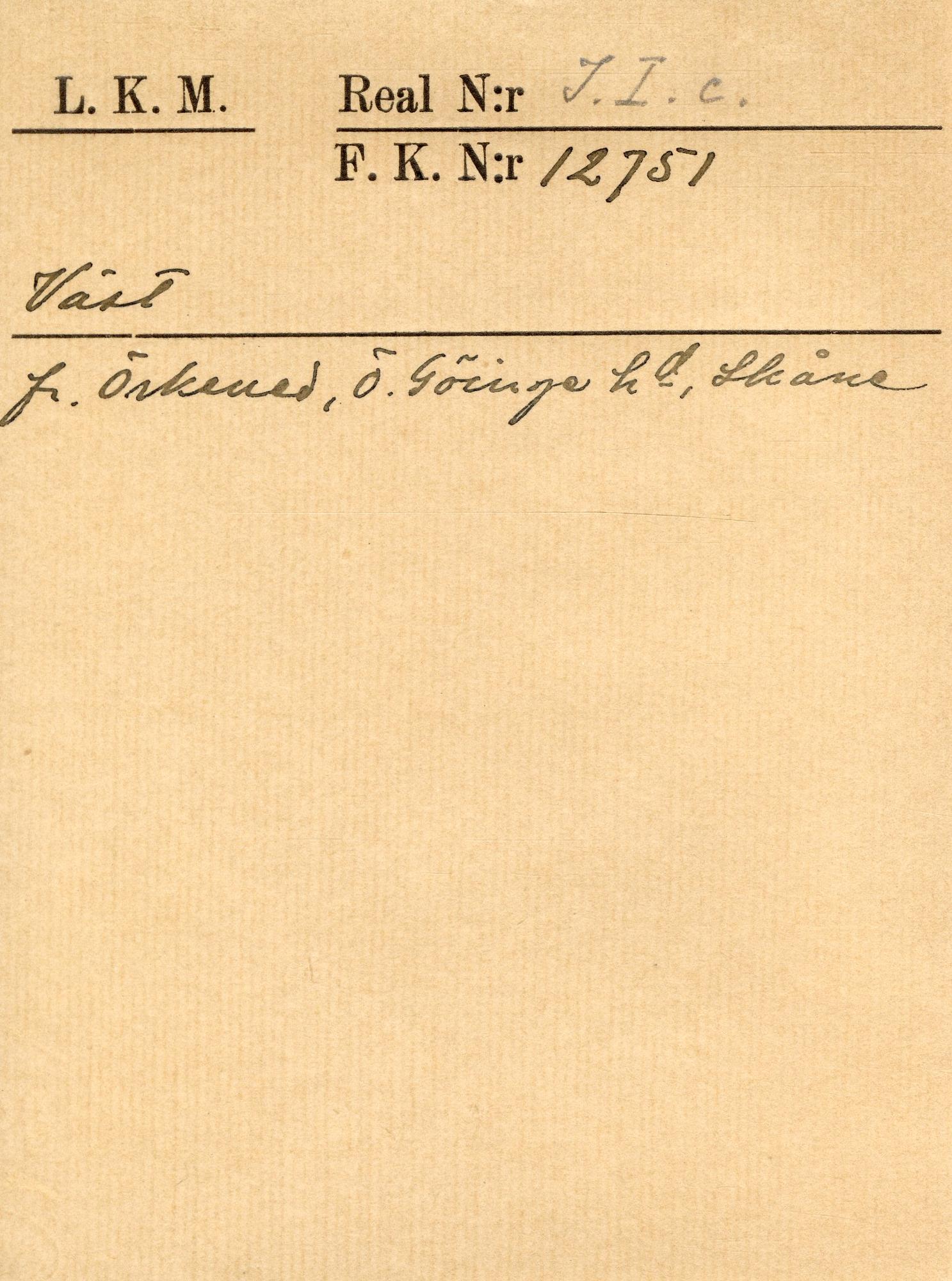Randig modeväst i bomull, i svart, rött och brungult samt med flossade ylleränder i ljsugrönt, mörkgrönt, svart. Ca 5 cm hög ståndkrage samt inskurna fickor, en på var sida fram. Fickorna, kragen och vänstra framstycket kantade med smala svarta sammetsband. Ryggstycket av linnelärft, liksom fodret. Knäppes fram med 6 st mässingsknappar med Karl XIV Johans namnchiffer. På vänstra framstyckets insida en inneficka av grövre linnelärft.