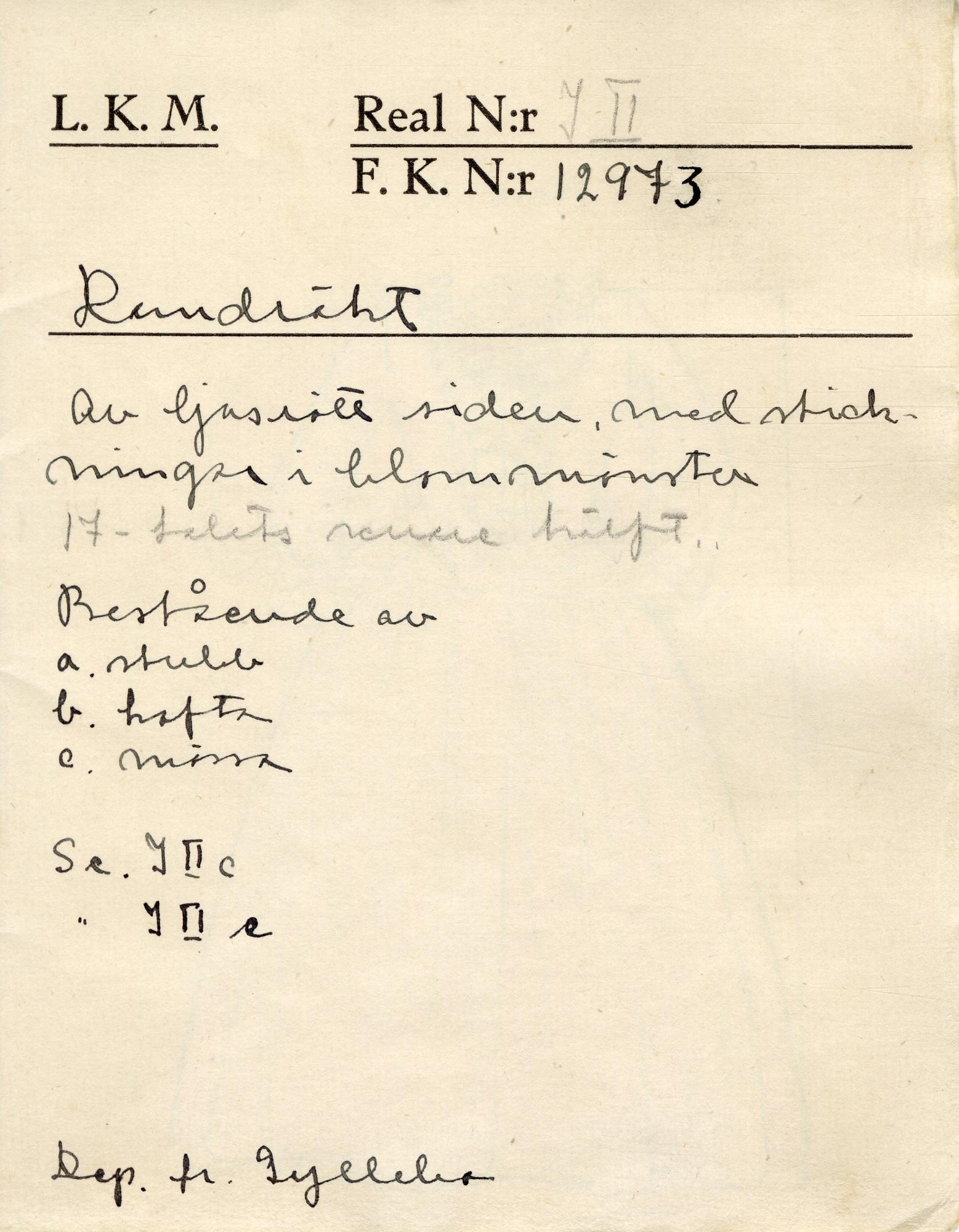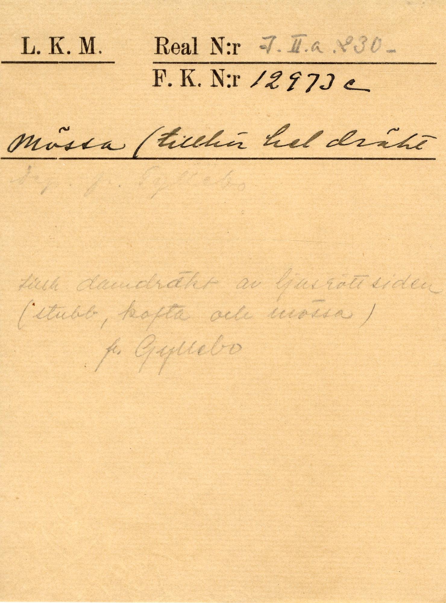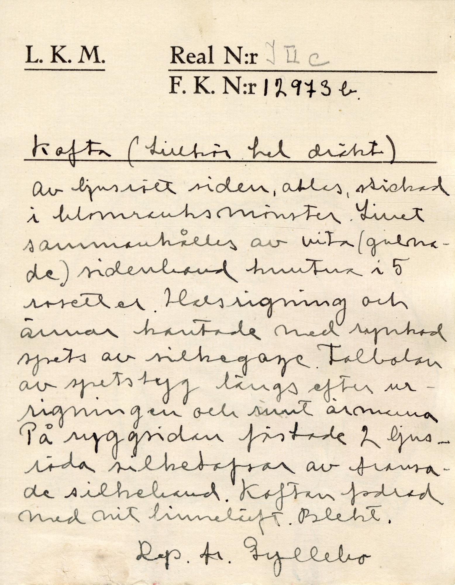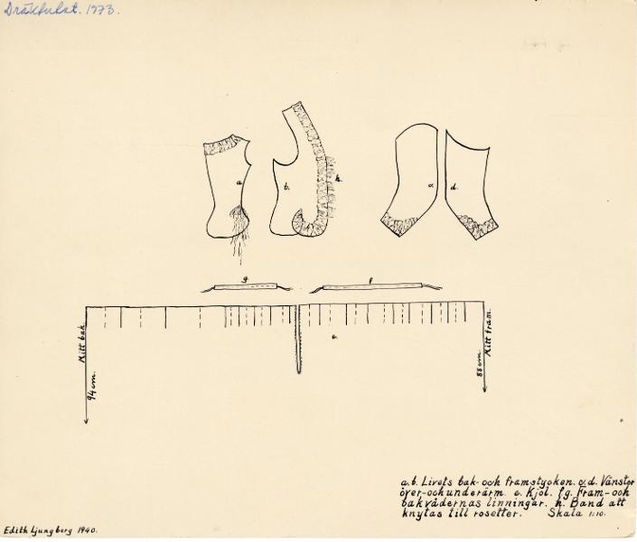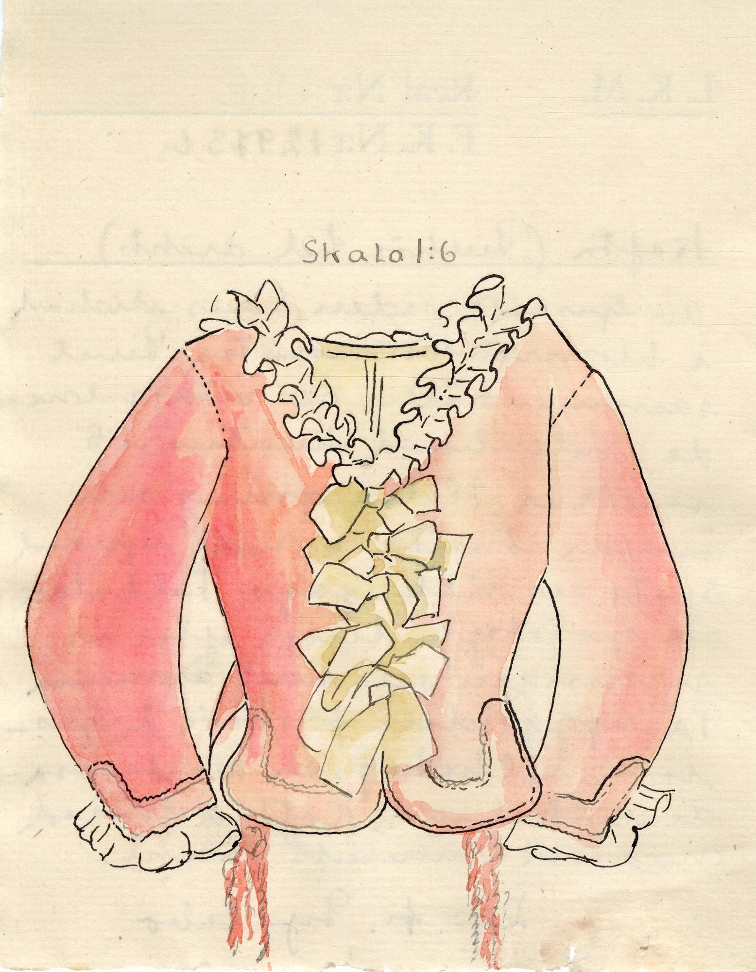 "Kofta och stubb av rosa sidensatin, stickade i ett magnifikt mönster som för tankarna till 1740-talet. Koftans skärning talar däremot för att den tillkommit någon gång omkring 1770. Den kan möjligen ...