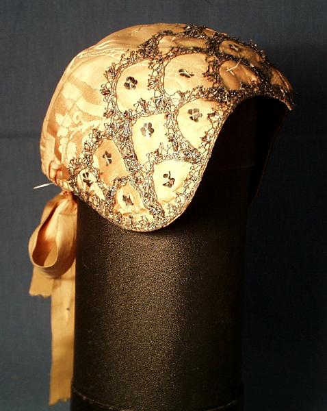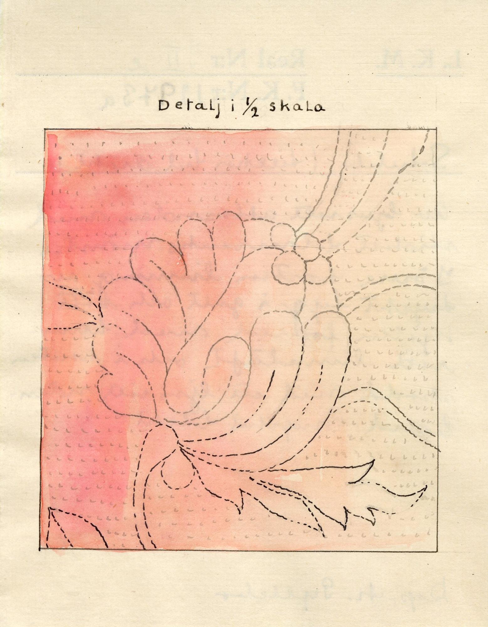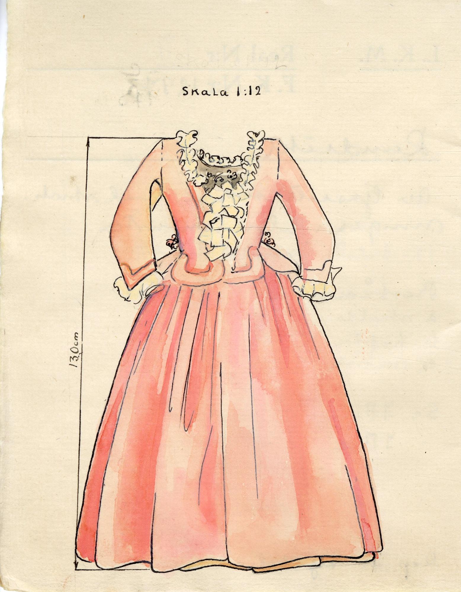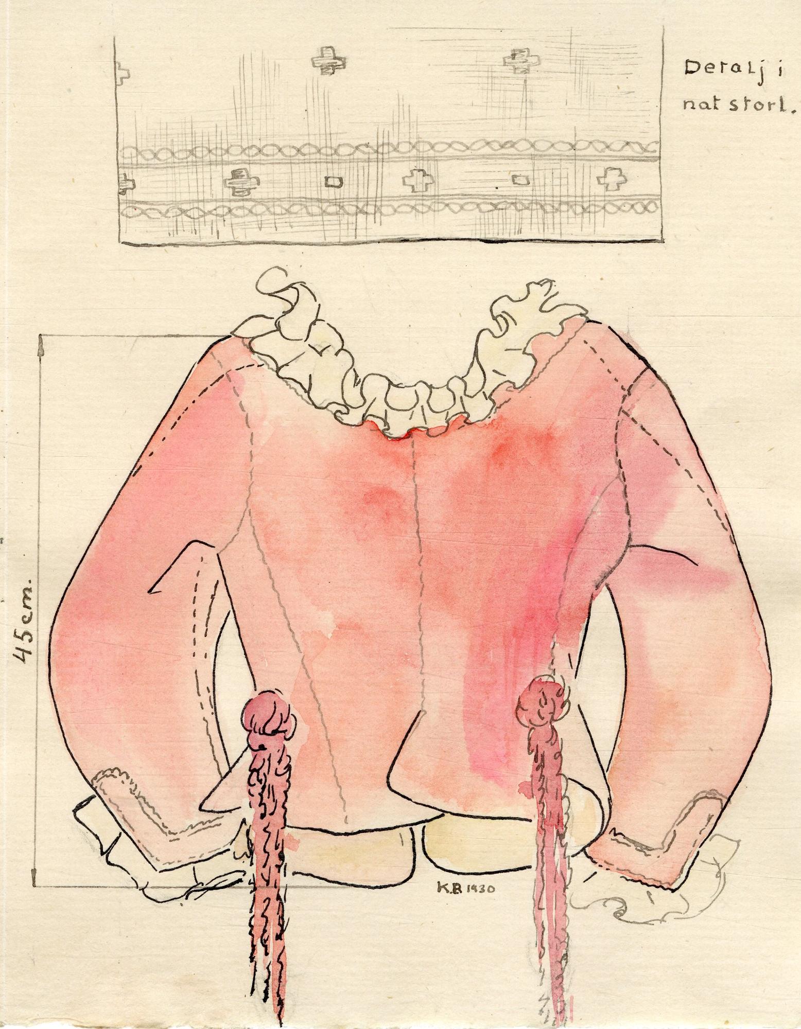 Rosa, mycket fälld. Matelasserad i blommor, blad och slingor. Koftan med smal, svängd ärm. Djup halsurrungning. Kort skört med 5 uppslitsningar, avrundade hörn. En silkestofs i vardera sidan. Framtill, kring halsurringningen och hanled en rynkad garneringsremsa av mönstrad tyll, kantad med ett smalt gallerband. Vitt foderlinne i koftan, mörkt rosa i stubben. Koftan knyts fram med fem par vita, mön...