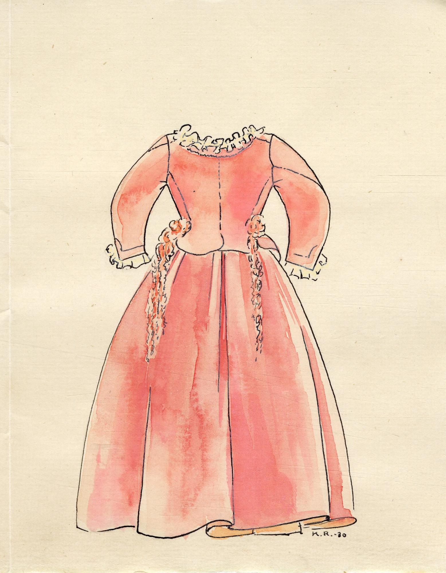 Rosa, mycket fälld. Matelasserad i blommor, blad och slingor. Koftan med smal, svängd ärm. Djup halsurrungning. Kort skört med 5 uppslitsningar, avrundade hörn. En silkestofs i vardera sidan. Framtill, kring halsurringningen och hanled en rynkad garneringsremsa av mönstrad tyll, kantad med ett smalt gallerband. Vitt foderlinne i koftan, mörkt rosa i stubben. Koftan knyts fram med fem par vita, mönstrade ripssidenband. Stubben sydd i 6 våder, ca 54 cm breda. Kjolens veck lagda bakåt. Linningen i två delar, knyts samman i sidorna. Koftans siden något tunnare, förstärkt med linnelärft, ull, vit och stoppning. Stickningarna gjorda med rosa silke. Ryschet runt hals och handled med sekundär spets över. Även stubben stoppad med ull, stickad med beige silke, i för- och efterstygn som koftan. 2 sprund. I nederkanten märkt med korssöm i metalltråd under krona IMH = Johanna Maria Han [oläsligt] ler.