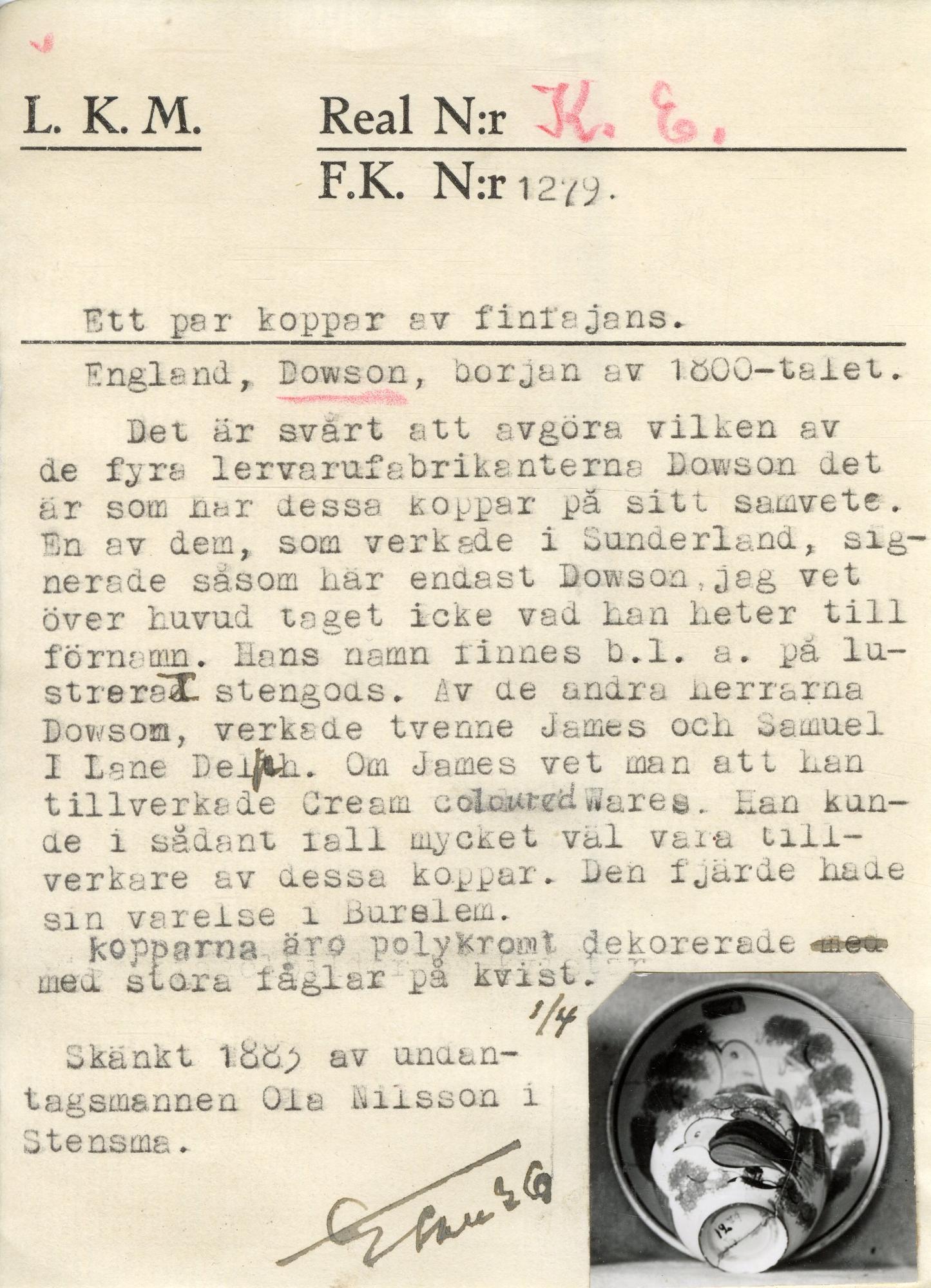 Rund kopp med vidgade sidor uppåt, fotring. Vitglaserad på in- och utsidan. Målad dekor i form av svart band på insidan och grön, gul svart dekor i botten. Fågel i träd på utsidan. Trädkronan sedd underifrån. Runt, skålformat fat. Vitglaserat, samt samma dekor med fågel, träd och svart dekorrand.