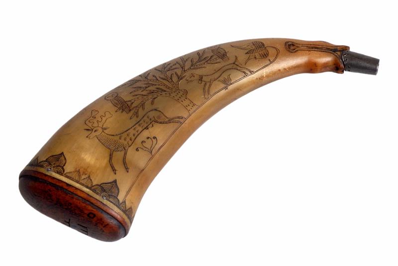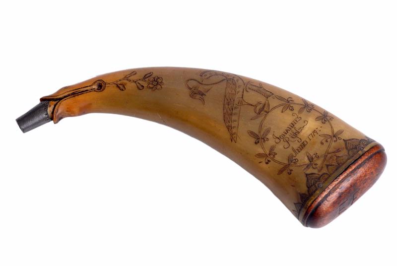 • Av tillplattat kohorn med mynning av metall och botten av trä. Skuret [ristat] mönster, fågel växter m.m. samt inskription "Johannes Rÿhl ANNO 1719" samt i träbottnen " EF".