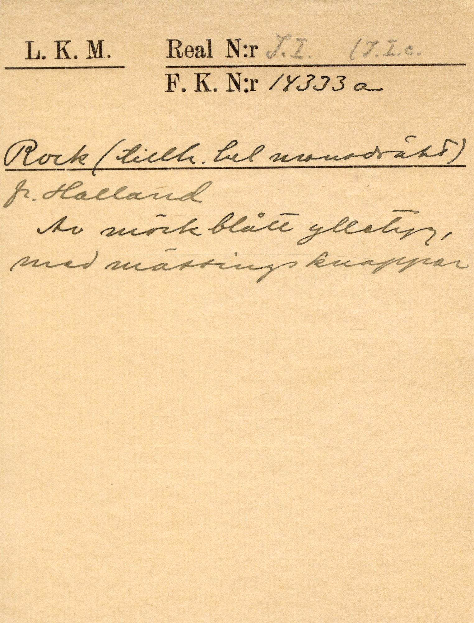 • Rock (till. hel mansdrökt) fr. Halland. Av mörkblått ylletyg, med mässingsknappar [övrig information saknas på katalogkortet]