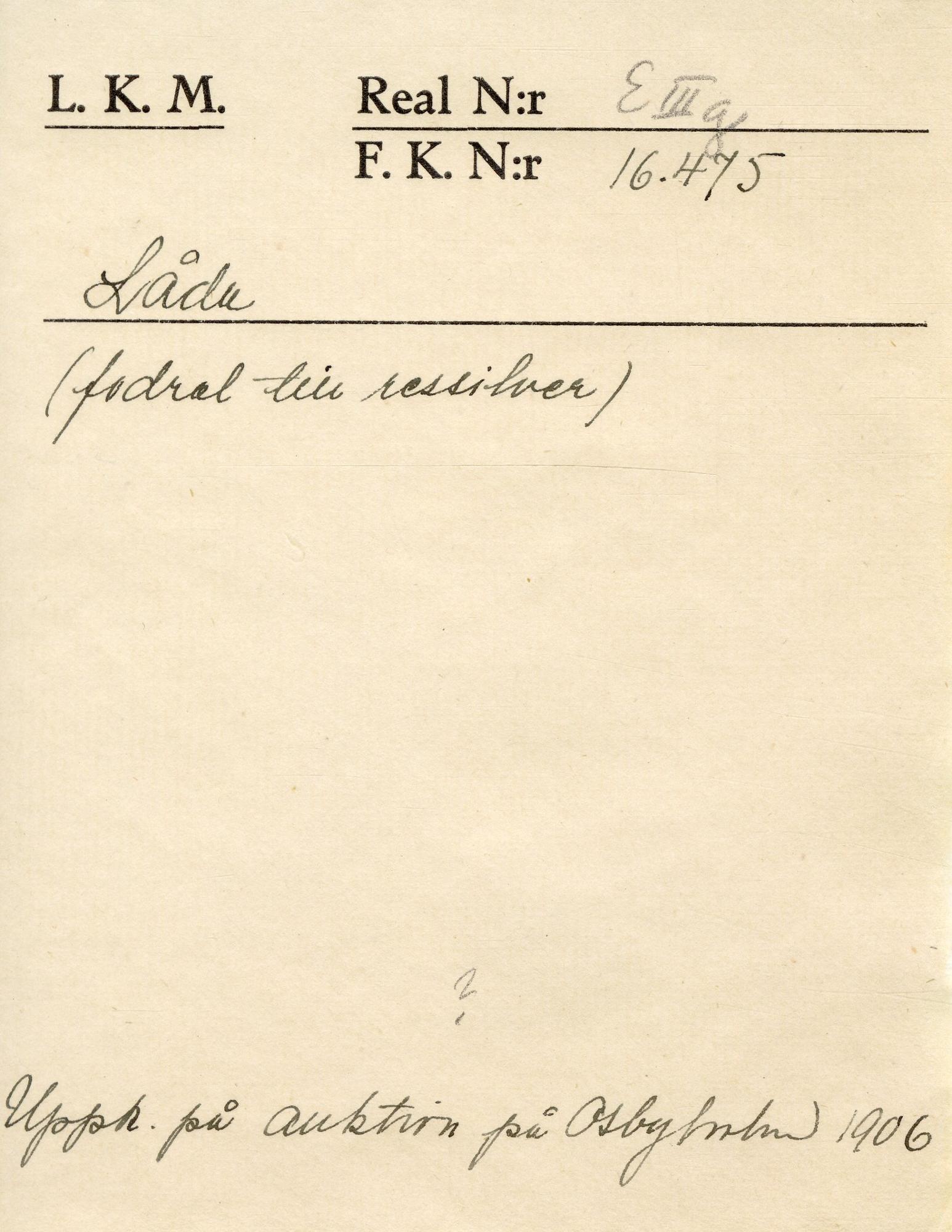 • Reseskrin för silverservis. Rektangulärt, med lock. Av fur, utvändigt klätt med svart läder som på lockets ytterkant har en tryckt tulpanbård i relief. Lockets kanter något fasade. Hörnbeslag, kantbeslag, den genombrutna och profilerade nyckelskylten samt bärhandtag av mässing, alla utom det sistnämnda graverade. Insats med fackinredning för kaffekanna, gräddkanna med mera. Under insatsen och på l... Visa hela