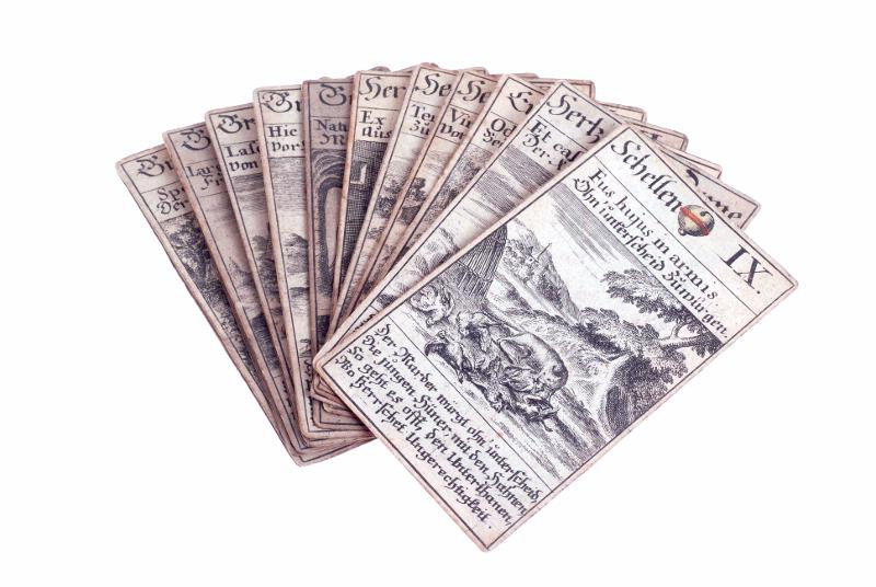 Består av 16 st kort. Med färgbeteckningarna "Hertzen", "Grüne", Schellen" och Cychel" "De klädda " korten kallade "König", "Dame" och " Bauer" Valörerna 5-2 ej med. Av H-n saknas 10,9 och av Sch-n. D.B.8. Valörbetckningen, bestående av färgens namn och i mitten en bild av respektive hjärta, blad, bjällra och ekollen samt en romersk siffra eller namnet på de klädda korten, står överst, därunder en latinsk sentens (=Tänkesätt, levnadsregel eller en allmän sanning av latinets sententia, 'mening'. ) med tysk översättning, på mitten en bild, ett ej färglagt stick och längst ner en tysk vers. Baksidan vit. Typen tillverkad i Tyskland redan på 1600-talet och i viss mån även naturuppfattningen talar för 1700-talet.[2022 återfans 16st kort i arkivet och återfördes till Diabasen där 14st kort förvarats. Johanna Hermansson 2024-04-24]