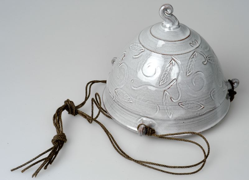 Halvklotsformad med utdragen botten vilken avslutas med en skulpterad volut. Upptill på sidan tre mindre voluter kring vilka ett tjärat snöre är fäst för upphängning. Stämplad dekor. Gråvit glasyr.