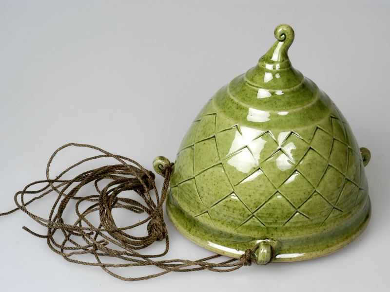 • Halvklotsformad med utdragen botten vilken avslutas med en skulpterad volut. Upptill på sidan tre mindre voluter kring vilka ett tjärat snöre är fäst för upphängning. Pressat rutmönster. Grön glasyr.
