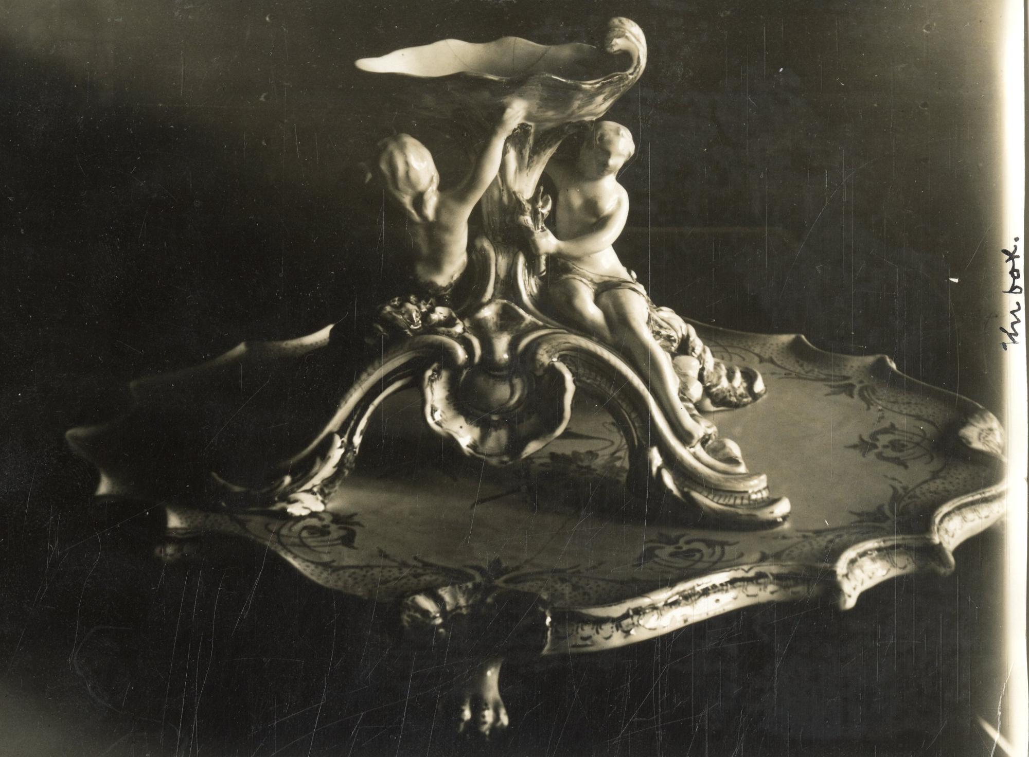 Gustav M. behandlar denna borduppsats i sin (?)avhandling: Konsthantverkaren Christian Precht, 1957, och ifrågasätter då om denna inte härhör från Precht, sida 290, samt figur 117.