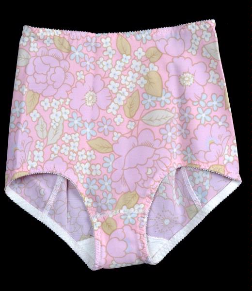 Rosa, kraftiga underbyxor med blommor och blad i ljuslila, ljusblått, vitt och beige. Vita gummiband i midjan och benöppningarna. Vit bomullstrikå i grenen.