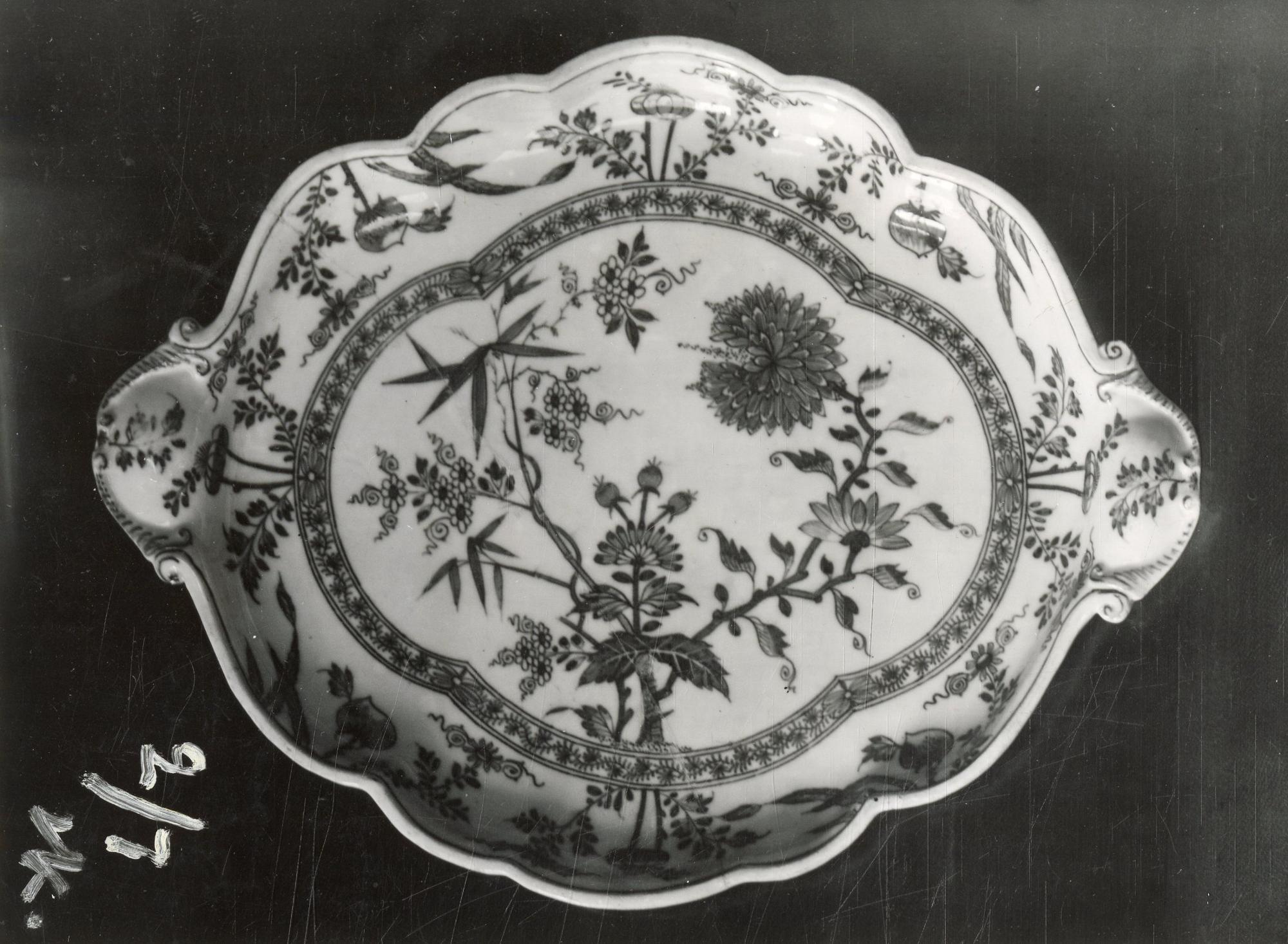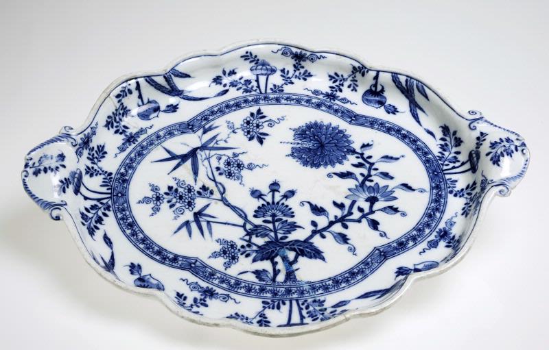 • Vågig kant, volutformade handtag. Lökmönster i blått under glasyr.