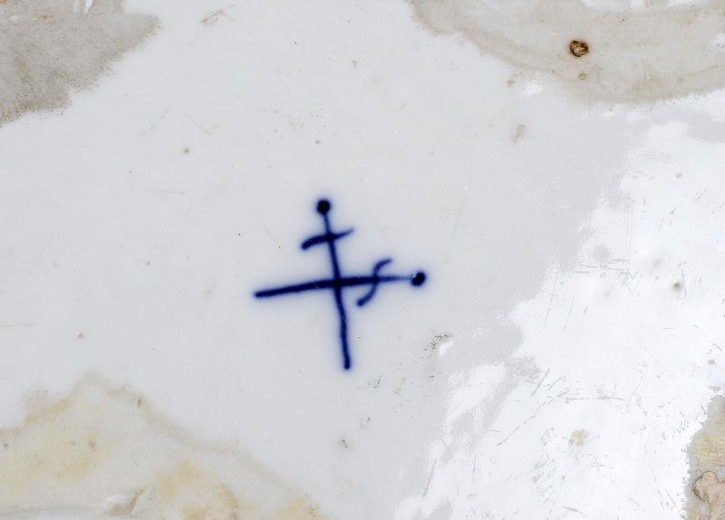 • Singerad: svärdsmärke i blått under glasyr [bild 2]; inpressat ett kryss med fyra punkter [avritat på katalogkort].