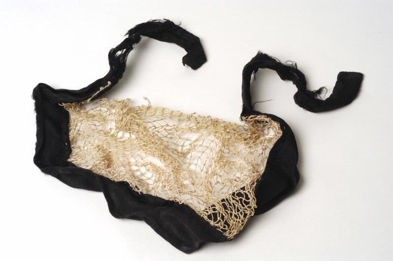 • Beige hårnät, garn, med svart band runtomkring, trasigt.