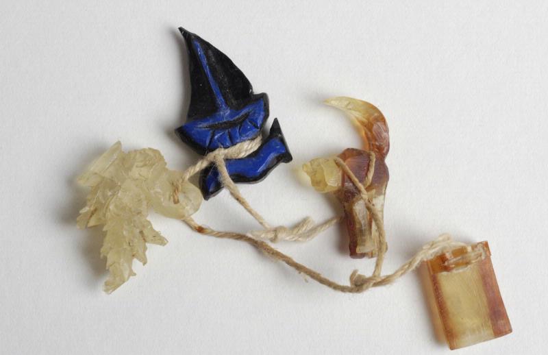 • Fyra berlocker i plast ihopknutna med lingarn, varje berlock ca 1-2 cm: blå segelbåt, brun katt, vit svan och beige fyrkant.