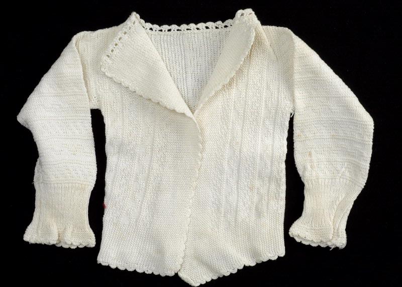 • Mönsterstickad, randig med vågband, prickar m.m. Uddade kanter. Gallerverk runt halsen för knytbandet.