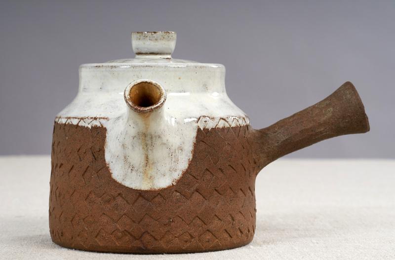 Vit tennglasyr på övre delen, oglaserad nertill, pip och handtag, ihåligt, rakt utstående, lock, stämplad reliefdekor över hela ytan.