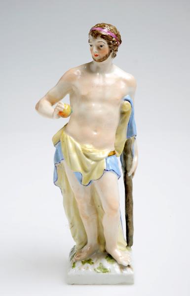 Paris. Helfigur, stående skäggig man, stödjer sig på en stav. Höftskynke, band eller krans runt huvudet. Rosa, blå och gul. Fyrkantig sockel.