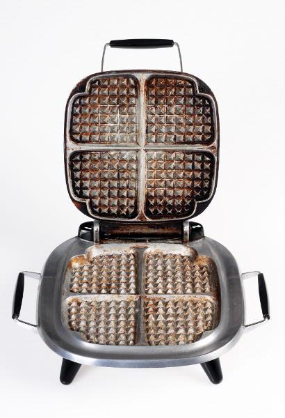 Elektriskt. Kvadratisk grundform med avrundade hörn, två plasthandtag på sidor för att lyfta järnet. Vilar på fyra avsmalnande plastfötter, välvt lock med svart plasthandtag. Textilklädd grå och vit sladd.