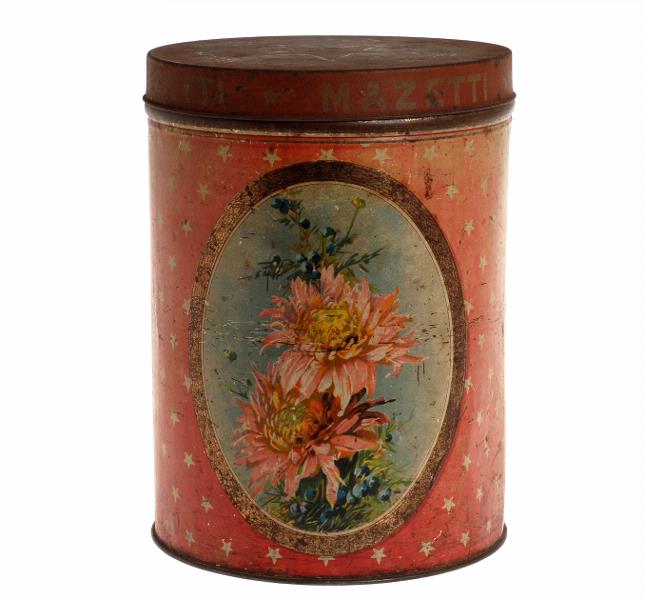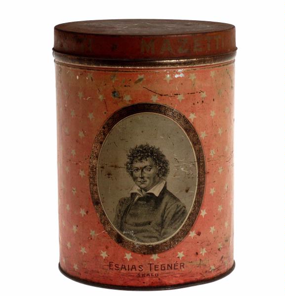 rund med lock; röd med vita stjärnor och guld, Mazetti, på framsidan bild av Esaias Tegnér, på baksidan blomstermotiv i färger. Inköpt på internetauktion med tanke på anknytningen till Tegnérmuseet. Burken visar skaldens enorma popularitet vid slutet av 1800-talet.