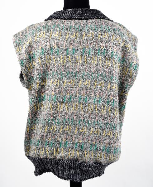 "Tröja och jeans från Bea Szenfelds kollektion Insert Coin från 2005. Kollektionen baserades på omgjorda vinterplagg och dess tema var nautisk kitsch." Utställningskatalog, Guldkorn ur samlingarna, 2013 i textilhallen.