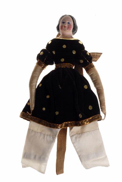 Så kallat dramatisk docka. Huvud av pappier maché, målat hår med lockar i nacken. Kropp av tyg, saknar ben. Ståltrådskrokar i stället för händer. I stället för fötter strutformigt vridet papper (nu lösa). I midjan är 2 svarta band fästa. Klädd i långbyxor och en klänning i brun sammet med paljetter och guldband. Antagligen sytts för hand. Även huvudet verkar vara hemmagjort.