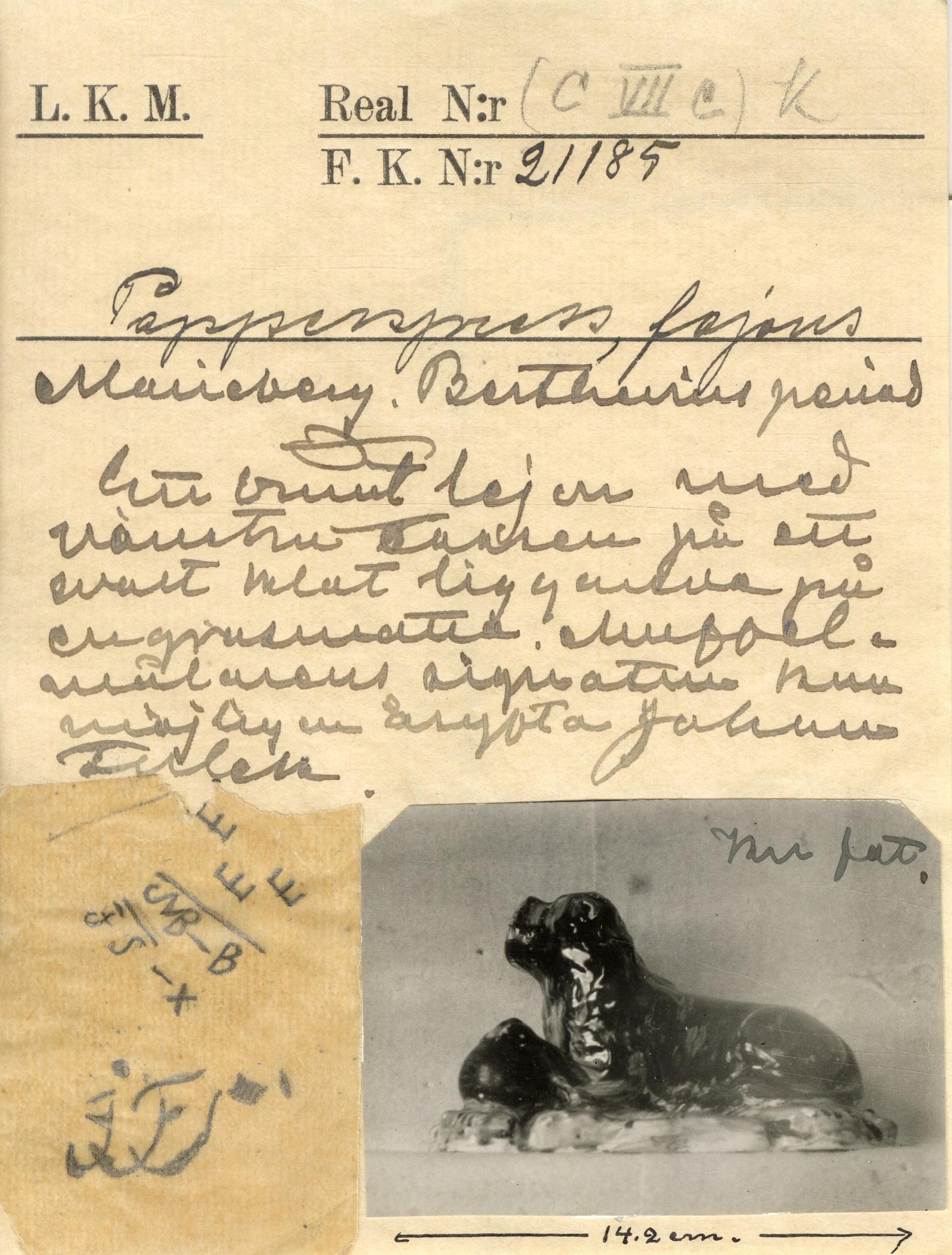 • I form av ett liggande lejon på en grönflammig rektangulär platta, med ena tassen på ett klot. Färger i överglasyr: grön, turkos och oliv med roda toucher. Lejonet rödbrunt med gula strimmor.