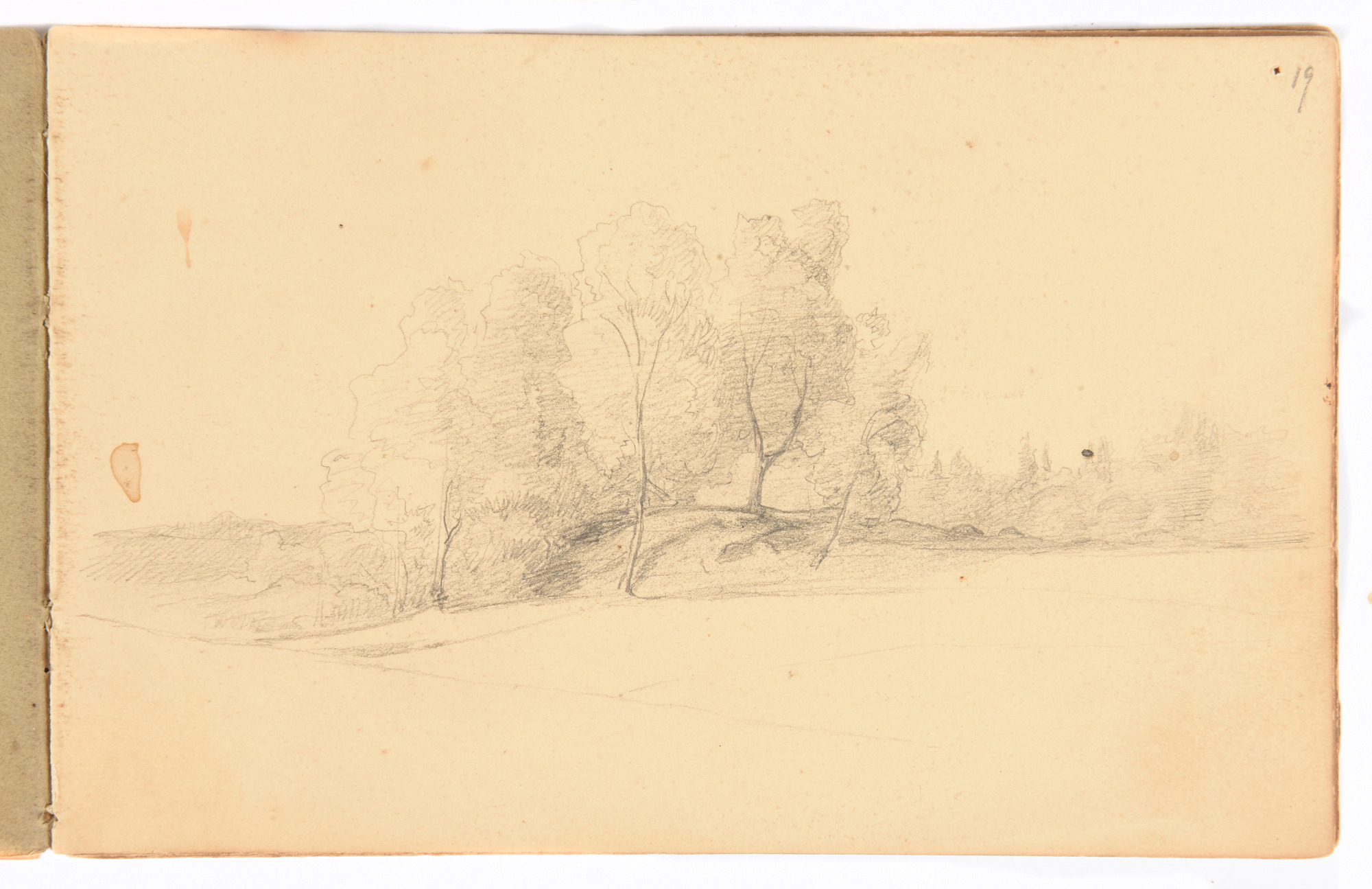 • Bokens blad Nr 19, framsidan. Blyertsteckning avbildande en trädbevuxen kulle.